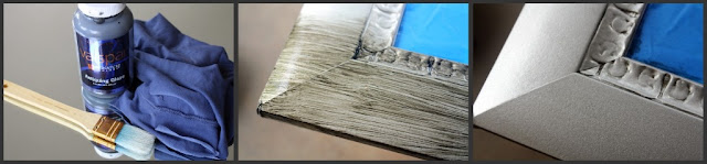 I decided to try an experiment on the off chance it might turn into a "happy accident." I got the antiquing glaze that I used when I refinished my night stands, and attempted antiquing the mirror frame. I painted some on and used a dry cloth to wipe it off in hopes that it would stick in the "hammered metal" spots on the paint to tone the shine down.